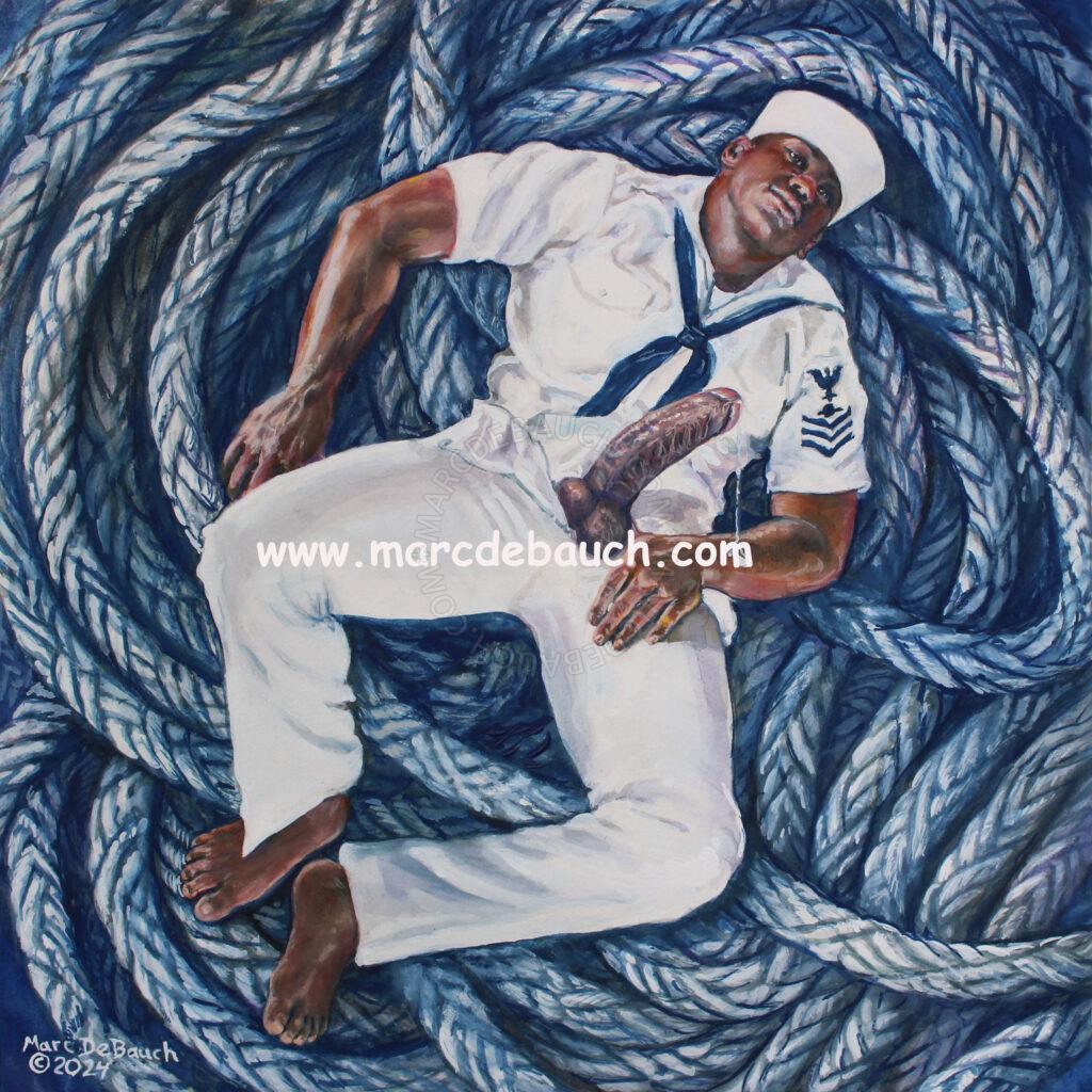 “Seductive Sailor” 2024 gouache on paper 14″ x14″ portrait of my model Rod, one of 4 paintings i will have in a new erotic art book “UNIFORMS”